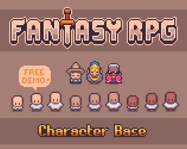 🕺 💃 Presenting a set of hand-crafted pixel character bases for your RPG. This pack comes with 3 different sprites (Small body, Medium body, Big body), 3 colours each, with idle and walk animations (4-sides).