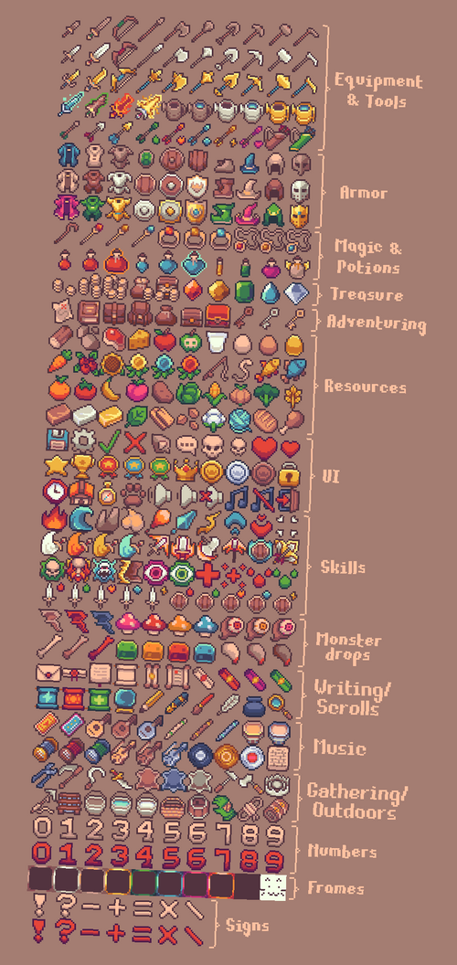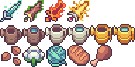 v2.2: 15 new icons. 4 Elemental swords (ice, earth, fire, lightning), 6 Watering cans (copper, steel, gold), and 5 resource icons (seeds, cotton, yarn, bread, chicken).