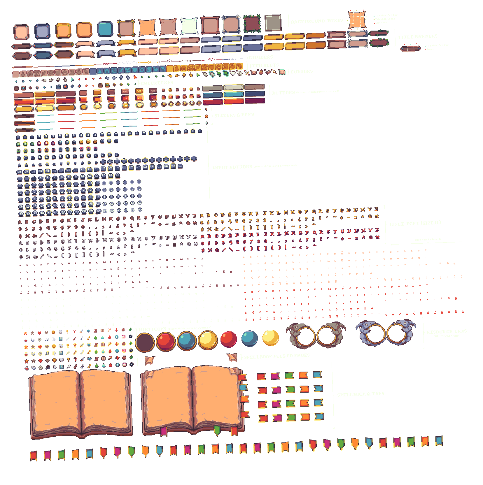 This pack is meant to work alongside my other Fantasy RPG asset packs (tilesets, characters, etc.). They all share the same colour palette and style: