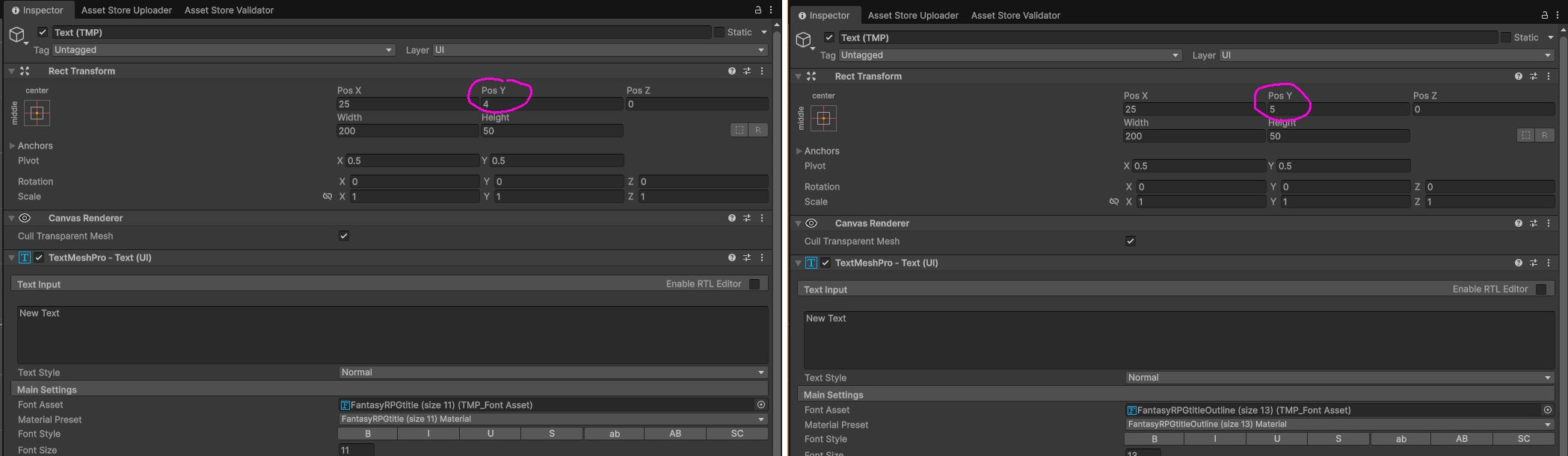 So for example, if "FantasyRPGtitle" Pos Y is 4, then "FantasyRPGtitleOutline" should be at 5. You can do this on the Inspector tab.